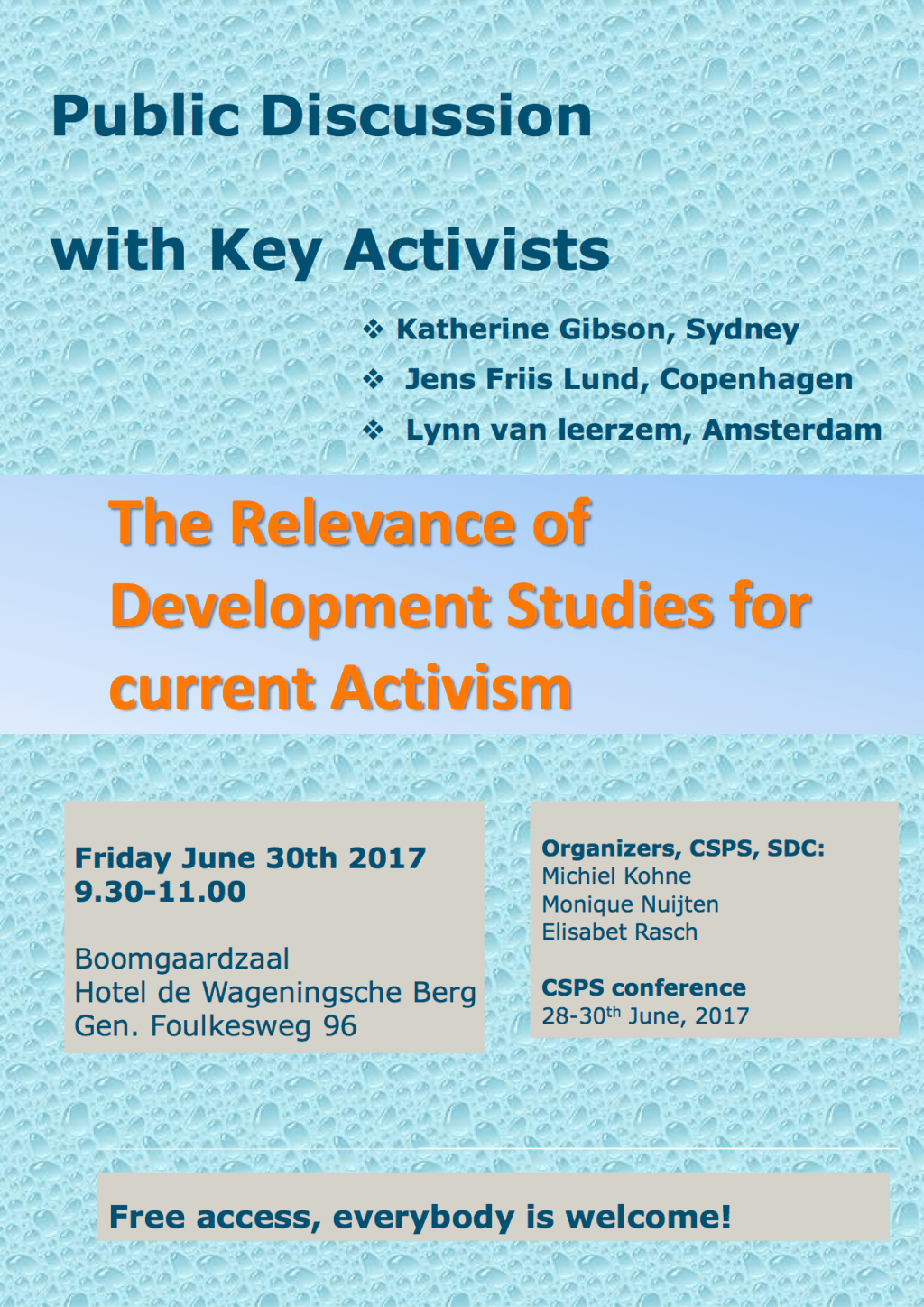 In this plenary discussion we want to discuss the relevance of International Development Studies for students in their workfield. An often heard complaint is that during their Bachelor’s or Master’s programme, students learn much about what is wrong in the world and how development interventions have failed. Yet, they are not introduced to forms of development/ change outside a neo-liberal/colonial framework. They feel that they have not been taught how to advance a position of responsibility in relation to the challenges of the current world. This is especially felt by students who after their Master in development studies get employed by activist NGOs. So the panel starts off with the question: “How can universities educate splendid activists (with a focus on Wageningen development studies)”.