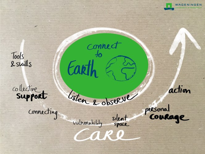 After revisiting the experience of our previous Presencing session, we collectively brainstormed ideas we’d like to take forward. We then formed clusters of ideas and picked four ideas to work on in small groups. The four clusters were: 1. personal courage & collective support, 2. spaces for silence & mindfulness, 3. connecting to Earth 4. a WUR Transformative Learning Hub. These ideas will be taken forward by the participants.