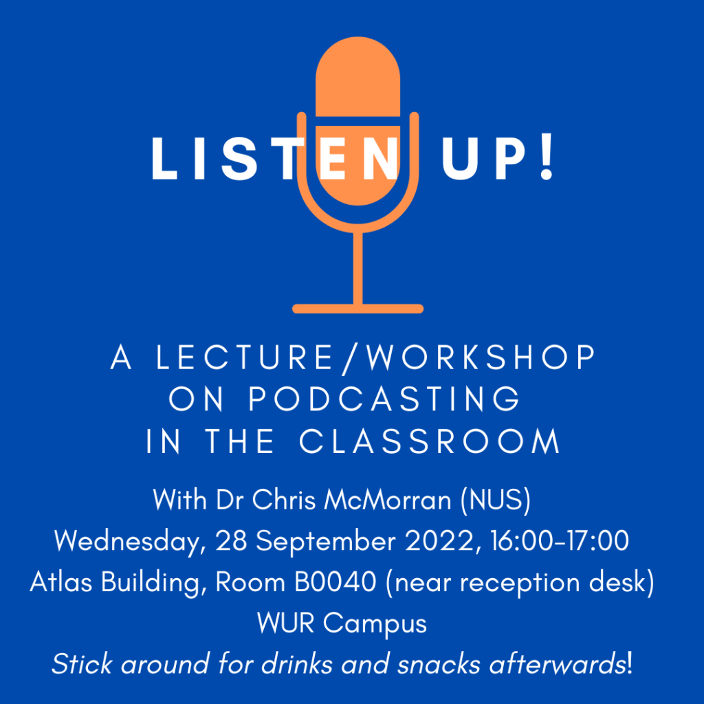 In this second Transformative Learning Hub session for September 2022, Chris McMorran (Assoc. Prof., National University of Singapore) will explore the pedagogical possibilities of podcasting. Chris is a cultural geographer with broad research interests in the geographies of home and the geographies of teaching and learning.