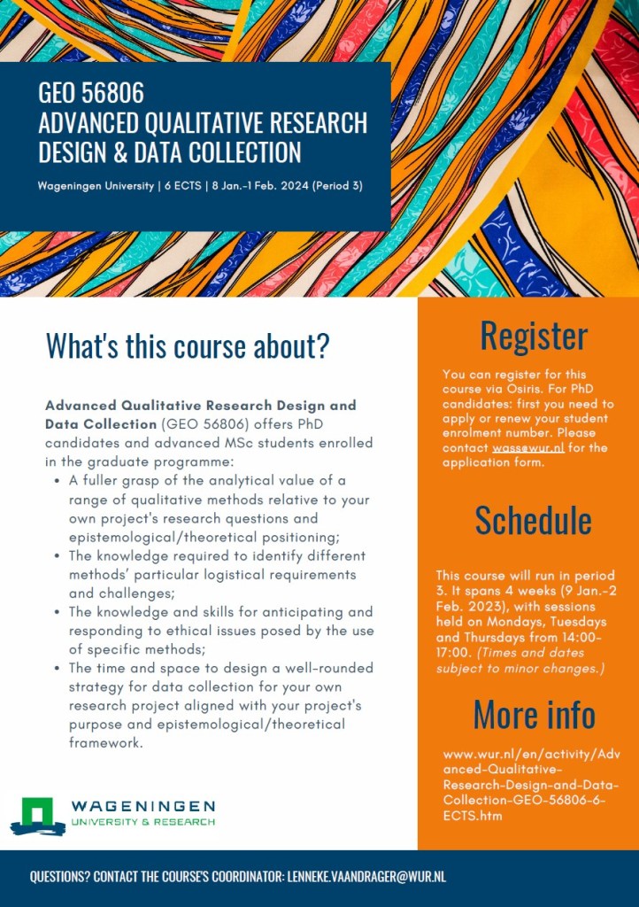 Advanced Qualitative Research Design and Data Collection (GEO 56806) offers PhD candidates and advanced master’s students enrolled in the graduate programme: