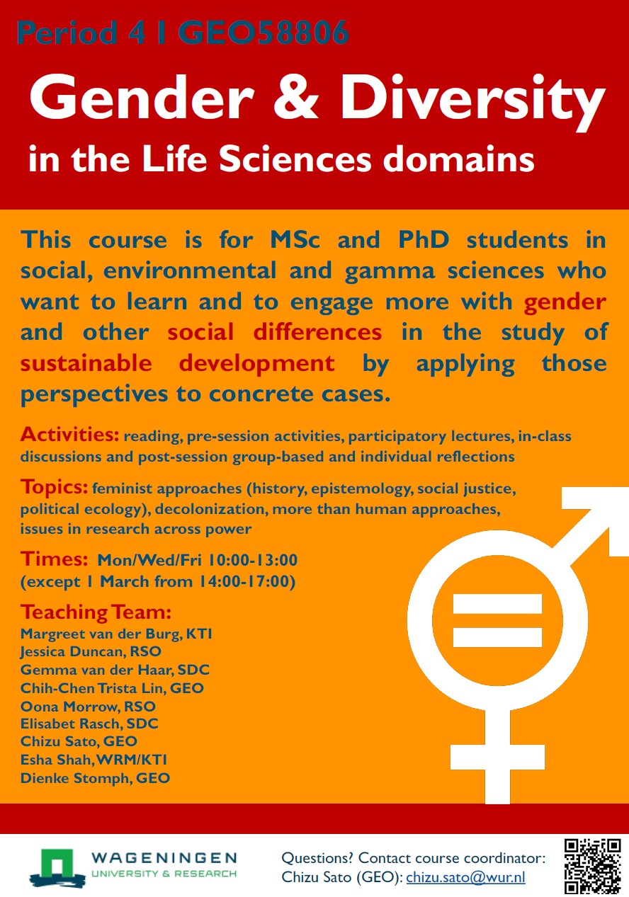 Today, research in the life sciences done to support sustainable development is increasingly interdisciplinary and demands better understanding of roles of gender and other differences, such as race and colonial history. This course directly enables participants to develop, operationalize and integrate a critical gender framework into their own research. The manner in which participants work gender into their own research may then be independently replicated in integrating other relevant concerns.