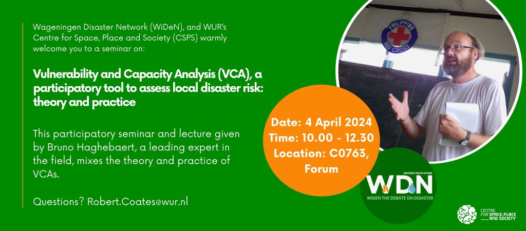 Join the Wageningen Disaster Network (WiDeN) and Centre for Space, Place and Society for a seminar on “Vulnerability and Capacity Analysis (VCA): Theory and Practice.”