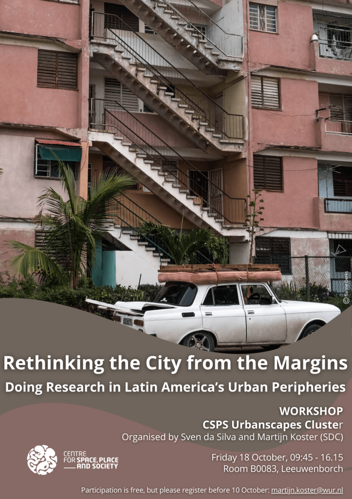 During this day, a select group of invited senior researchers will present their research in the urban periphery of Latin America. We will close the day with a plenary discussion in which we explore how we can rethink the city from the periphery. Our speakers are Flávio de Souza (Universidade Federal de Pernambuco, Recife, Brazil), Pieter de Vries (Wageningen University), Luisa Steur (University of Amsterdam) and Sonja Marzi (Radboud University).