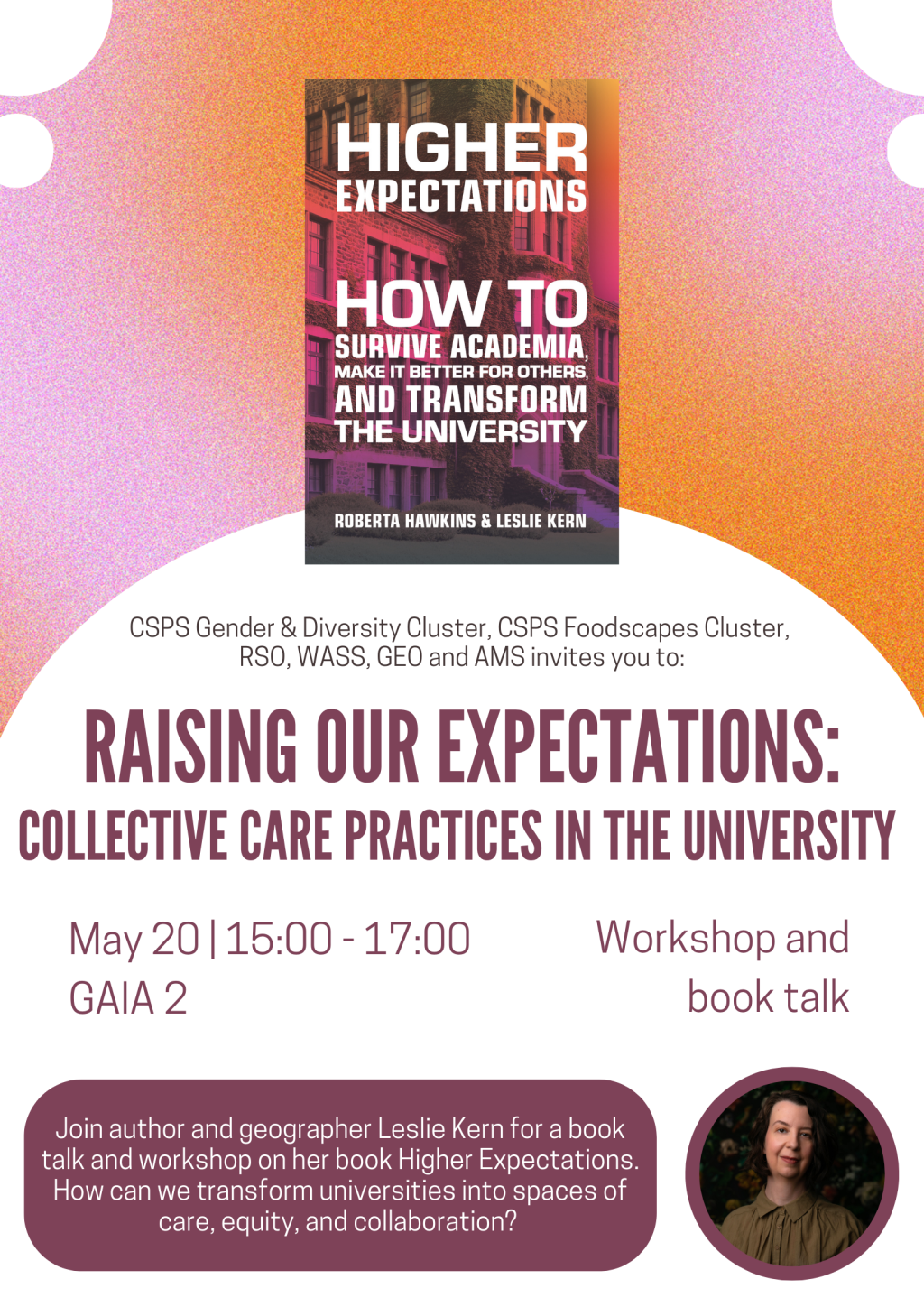 On May 20, Leslie Kern returns for a book talk and workshop on her book Higher Expectations. This session will explore how academia can transform into a more equitable, caring, and collaborative space.