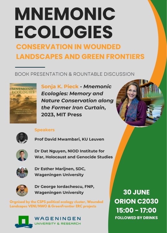 The book presentation will be followed by a roundtable discussion with Prof. dr. David Mwambari from KU Leuven, who will add additional insight from a memory studies perspective and vernacular memories in the African Great Lakes region, Dr. Dat Nguyen from the NIOD Institute for War, Holocaust and Genocide Studies , who will reflect on the relation between conflict and the environment in Vietnam from a historical perspective, and Dr George Iordachescu from WUR who will unpack the frictions between conservation in marginal spaces and EU’s green growth vision. Dr. Esther Marijnen from WUR, will conclude, with insides from her wounded landscapes project – on political ecologies of grief and mourning.