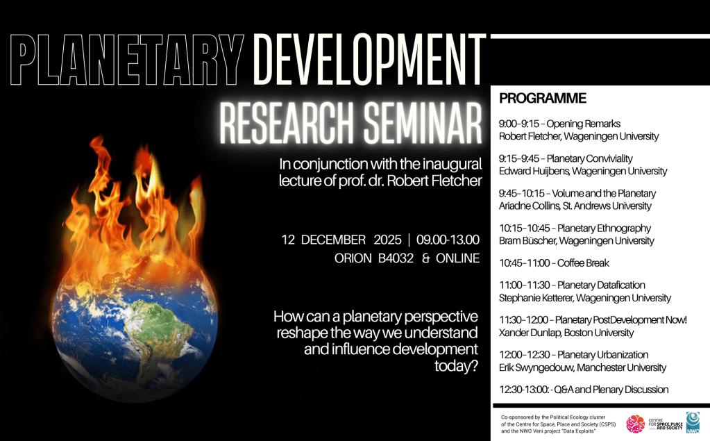 You are warmly invited to attend the research seminar Planetary Development, taking place on 12 December 2025 from 09:00 to 13.00 in Orion B4032 at Wageningen Campus, with online streaming available for remote participants.
