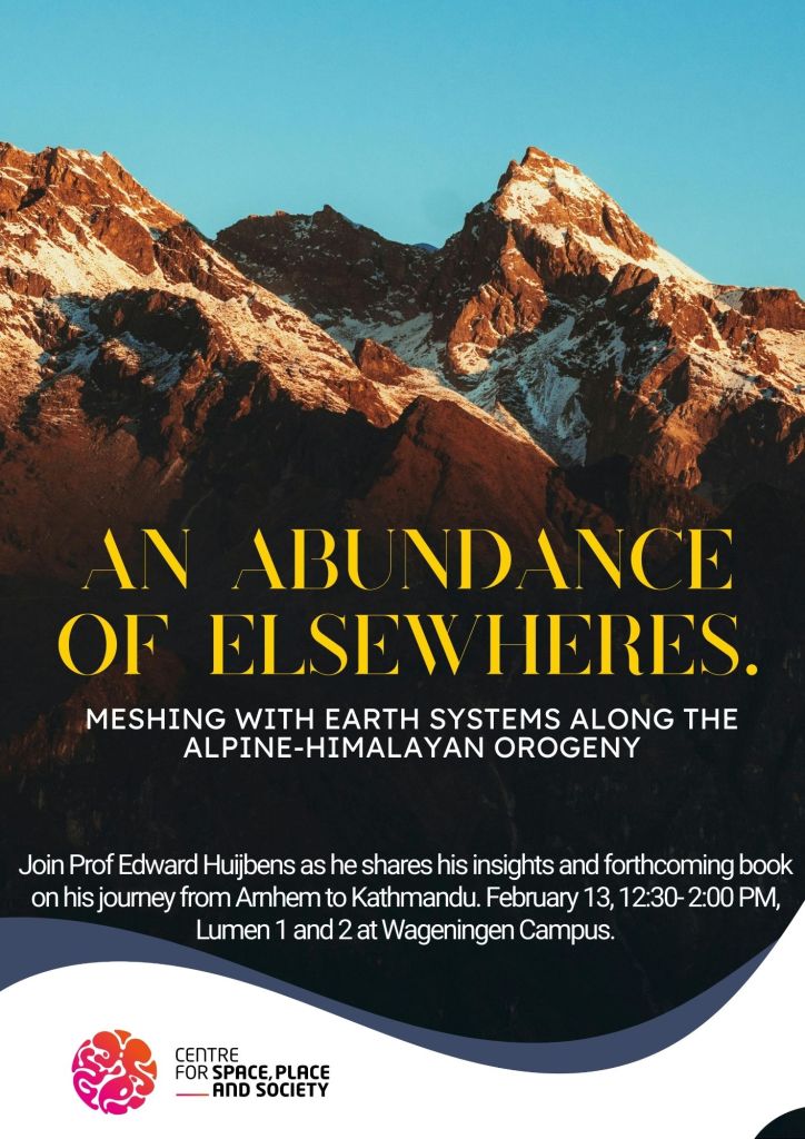 Join Prof. dr. Edward H. Huijbens (Cultural Geography Group, GEO) as he shares insights from his autumn 2025 sabbatical—a three-month journey from Arnhem to Kathmandu using only public transport. Inspired by this adventure, he is finalizing a book under the working title An Abundance of Elsewheres: A Convivial Geography of the Alpine-Himalayan Orogeny.